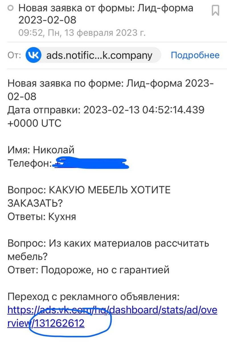 Заявки сейчас приходят на почту. В заявке видно ответы и метка рекламного объявления, с которого пришел лид.